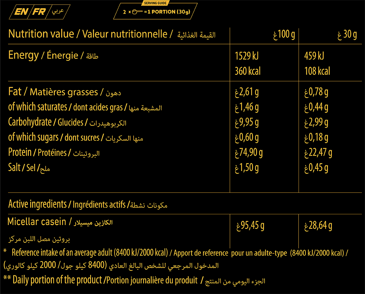 La CASEIN de Golden Body DZ est l’alliée indispensable pour protéger votre masse musculaire contre le catabolisme. Contrairement à la Whey, la caséine possède une structure unique qui ralentit sa digestion, permettant une libération prolongée d’acides aminés dans le sang pendant environ 8 heures. C’est le complément parfait pour les périodes de jeûne nocturne ou les longs intervalles entre les repas. Elle favorise une récupération optimale et soutient la croissance musculaire pendant que vous dormez.